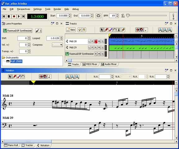 Frinika is a free complete music workstation software containing sequencer, midi support, soft synthesizers, audio recorder, piano roll/tracker/notation editing and more. The goal of Frinika is to be a complete platform for making music with your computer, using the versatile Java platform to be able to run on several operating systems, and being open source to be able to embrace the best open source technology being available at any time.