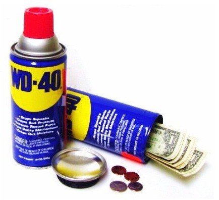 These WD-40 Cans have secret compartments where you can safely stash away anything you choose by twisting open the top of the can.These cans are indistinguishable from the genuine product and even weighted to feel full. The diversion safes are a unique home-security product to hide your valuables. You can buy there here.