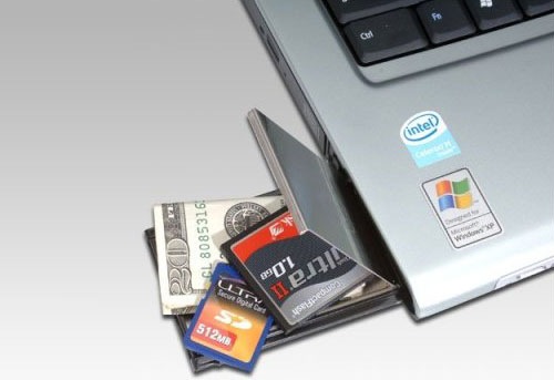 The Stash Card from Wireless Garden is a secret compartment that slides into the PC card slot in your laptop to stash away all sorts of stuff like Memory cards, Money, Stamps, Keys, Photos, and so much more. You can order online here
