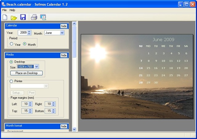 Sofmos Calendar software allows you to create personalized photo calendar. You can quickly create a calendar which you can print or place on your computer desktop. You have a wide range of options available to customize the calendar appearance. You can create a calendar for month or for year, insert a picture and specify fonts and colors. You can download the trial version here and buy the software if you like it.