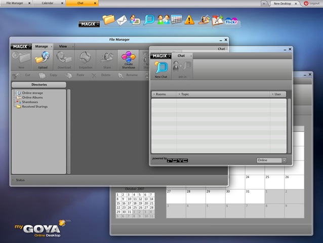 - myGoya includes, file manager, calendar, mail management, flickr widget, chat box and more