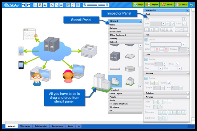 Cacoo is a user friendly online drawing tool that allows you to create a variety of diagrams such as site maps, wire frames, UML and network charts. Cacoo can be used free of charge to collaboratively work on the diagramming. Multiple users can edit the same diagram in a simultaneous collaboration.