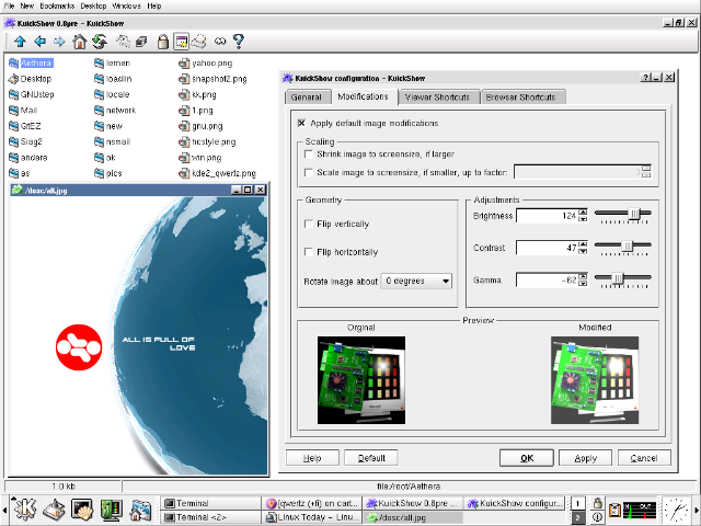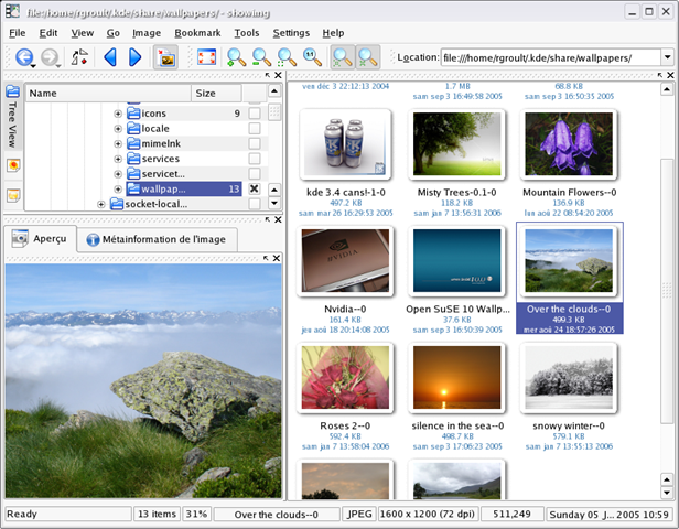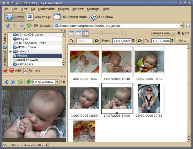 KuickShow is an image browser/viewer with a nice filebrowser to select images to be shown, slideshow support and the ability to display the following image formats: jpg, gif, tiff, png, bmp, psd, xpm, xbm, pbm and eim. Images can be displayed either in their own window, as large as the image, or fullscreen (which shrinks images too large to display). KuickShow also has a slideshow mode.