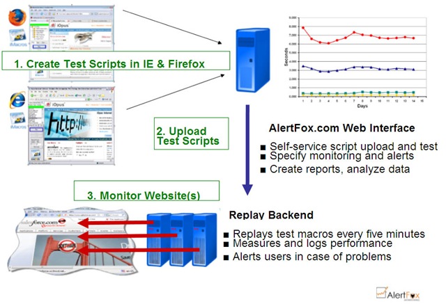 3. 100% Web Application Support – Monitor even complicated steps, (e.g. complete check out process, not just store uptime). For instance, AlertFox records and reports not only the uptime of an ecommerce store, but also it monitors all the complicated steps of the complete checkout process (transaction monitoring). This gives website owners confidence that their sites are performing as intended. And, because the transaction monitoring runs in real time in Firefox and Internet Explorer browsers, the real end user experience is monitored.
