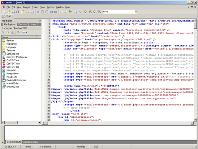 ConTEXT is a small, fast and powerful freeware text editor, developed to serve as a secondary tool for software developers. It has built-in syntax highlighters for C/C++, Delphi/Pascal, FORTRAN, 80×86 assembler, Java, JavaScript, Visual Basic, Perl/CGI, HTML, SQL, Python, PHP, Tcl/Tk, and its own syntax highlighter definition language. Other features are code templates and the ability to work with several document windows using the Multiple Document Interface.