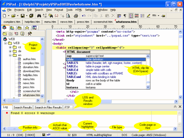 PSPad has many software development-oriented features, such as syntax highlighting and hex editing. It is designed as a universal GUI for editing many languages including PHP, Perl, HTML, and Java. It integrates the use of many project formats for handling and saving multiple files. Other features include autocompletion, tabs, FTP client and find/replace using regular expressions