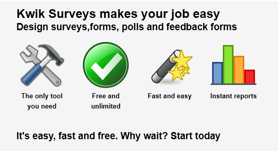 A really great Survey Builder which is completely free and easy to use tool. Try it here. Kwik supports, Surveys, Forms, Pools, Feedback forms and much more…