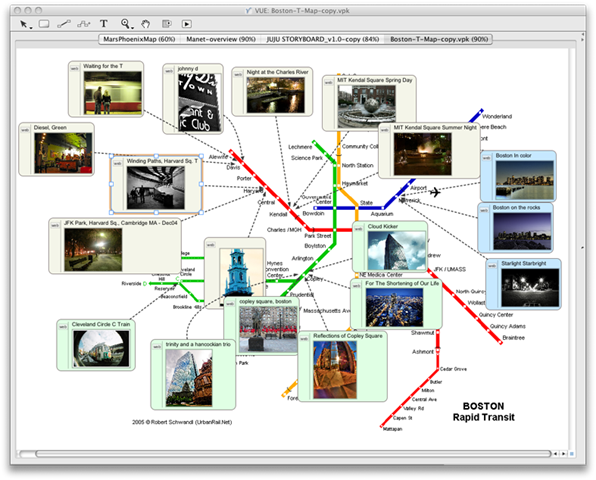 With the help of a simple set of tools and a basic visual grammar that consists of nodes and links, faculty and students can map relationships between concepts, ideas and digital content. Although originally developed with a focus on educational needs, VUE has grown to be used by people in many organizations working on engineering, graphic design, creative problem solving, construction, writing, and more.