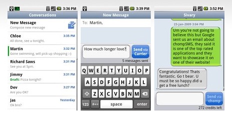 chompSMS is a great application for people who are busy SMSing and more frequently send SMS to international numbers. chompSMS has lots of features like an on-screen keyboard, signatures, chat bubbles, color customizations, and more. You can use chompSMS as a replacement to the built-in Messaging application, and send SMS messages via your mobile carrier as you normally do. Or, if your mobile carrier charges a lot, you can buy credits to send SMS messages via the chompSMS network, which can be much cheaper.