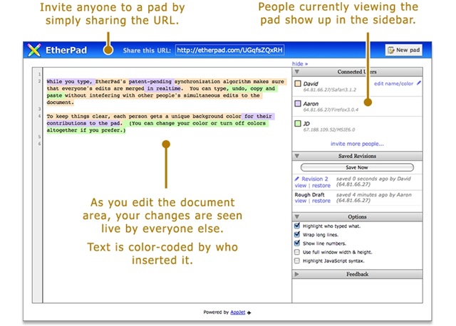 Collaborative tools are designed to help people involved in a common task achieve their goals. Team work is essential when you are writing a document and if multiple people can look into the single text, edit it collaboratively, know what changes were done by different people etc features would definitely boost the productivity to a certain extent. There are big players like Google Docs in Office 2.0 domain and they claim that they offer collaborative document editing features but in reality it is not true. There will always be a few seconds delay in other person knowing the changes done on the common document. Etherpad claims that it is as high as 15 seconds.