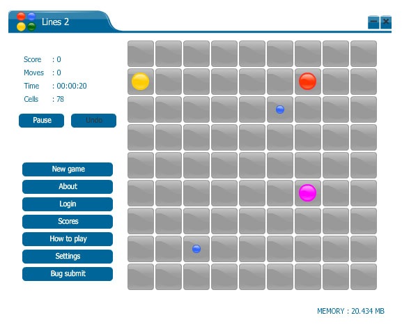 One of the most addictive games that you will easily get hooked on to. The game’s objective is to make as many lines a possible, by lining a minimum number of elements horizontally, vertically or diagonally (or combined). The minimum number of elements can be set in the game’s settings board and it varies between five and seven (seven is recommended for larger board sizes). The elements are colored in seven different colors, chosen as different as possible.