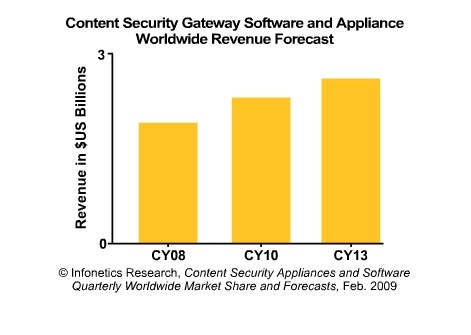 Content Security Appliances and Software – Infonetics reports that “Worldwide content security gateway revenue was up 25% from 2007 to 2008, hitting $1.9B, and will grow